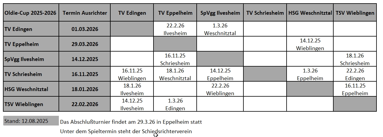 Zum zweiten Spieltags des Oldie-Cups gab es jeweils eindeutige Siege. Danke für das Mannschaftsbild des TV Edingen! Anbei aktueller Tabellenstand und Spielübersicht:
