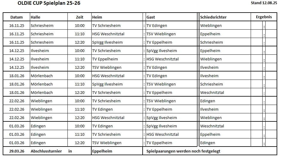 Am letzten März Sonntag fand in Schriesheim das obligatorische Abschlussturnier des Rhein-Neckar-Odenwald Oldie-Handball-Cup 2025 statt. Es waren alle Teams zugegen und lieferten sich spannende Duelle. In zwei 3er Gruppen setzten sich für die Halbfinalspiele die Teams von Schriesheim, Edingen, Weschnitztal und Eppelheim durch.