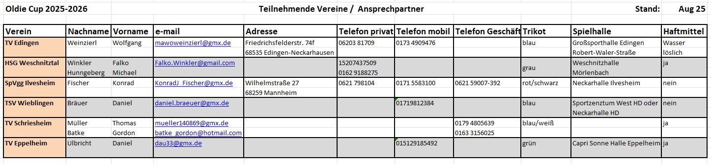 Am 17.7.24 fand traditionell im Clubhaus der SpVgg Ilvesheim die Sitzung der Vertreter der teilnehmenden Teams zur kommenden OldieCup Runde statt. Es sind leider wieder nur 6 Vereine, da die HSG Trutzburg aussetzen muss. Dafür dürfen wir mit dem TV Eppelheim ein neues Team begrüßen! Herzlich Willkommen und viel Erfolg an alle Teams.
